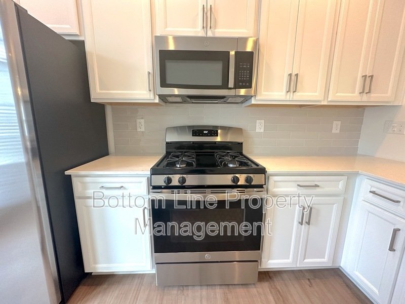 Equipped with a stainless steel and black appliance mix, including a refrigerator, dishwasher, microwave, and electric range/oven. A breakfast bar, ample cabinet storage, and pantry closet make meal prep easy.