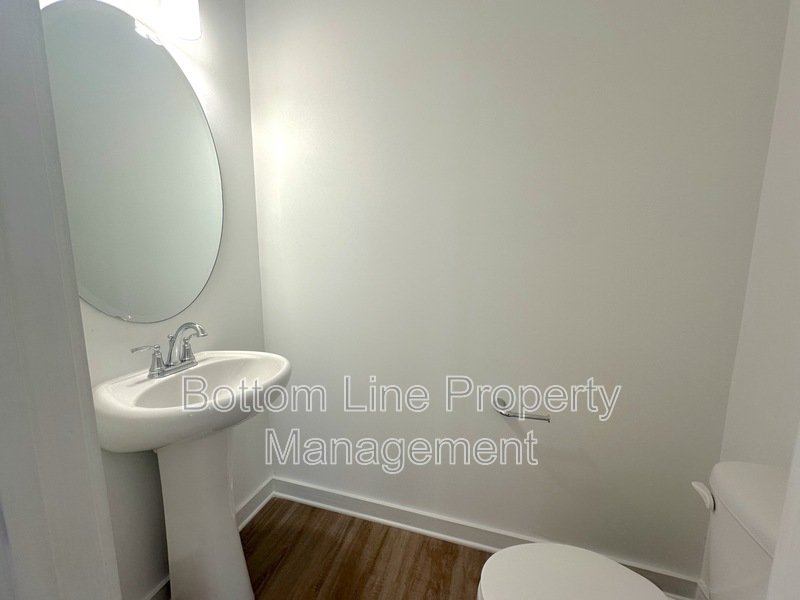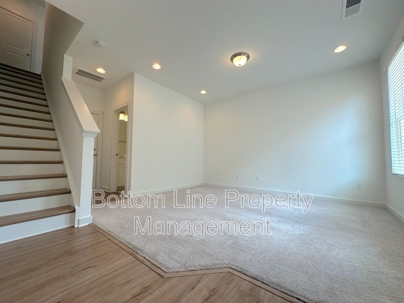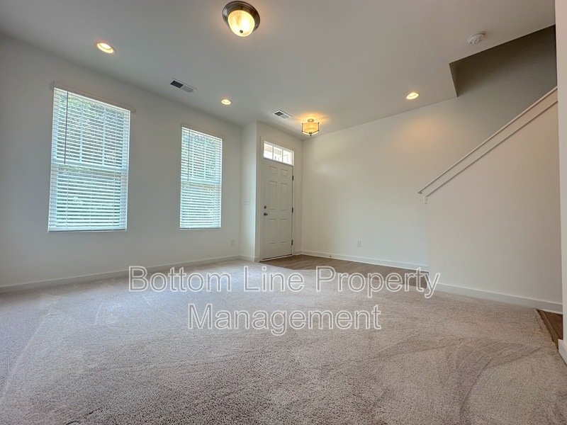 The spacious living room features durable flooring, neutral finishes, and natural light. A guest half-bath is conveniently located just off the entry.