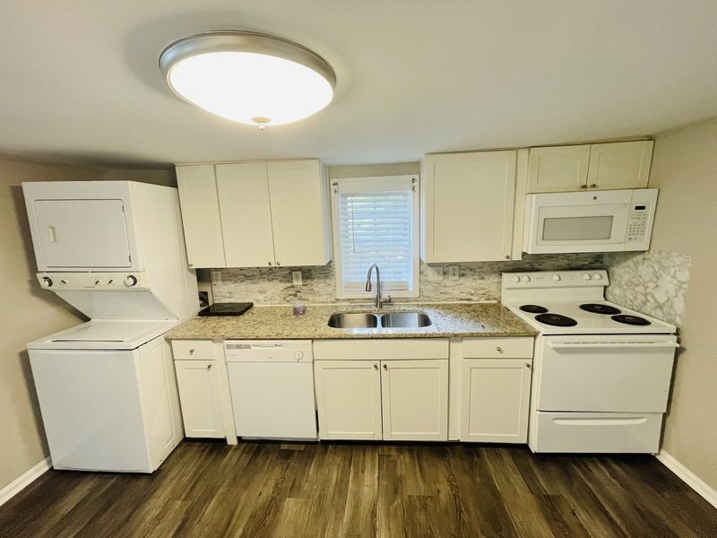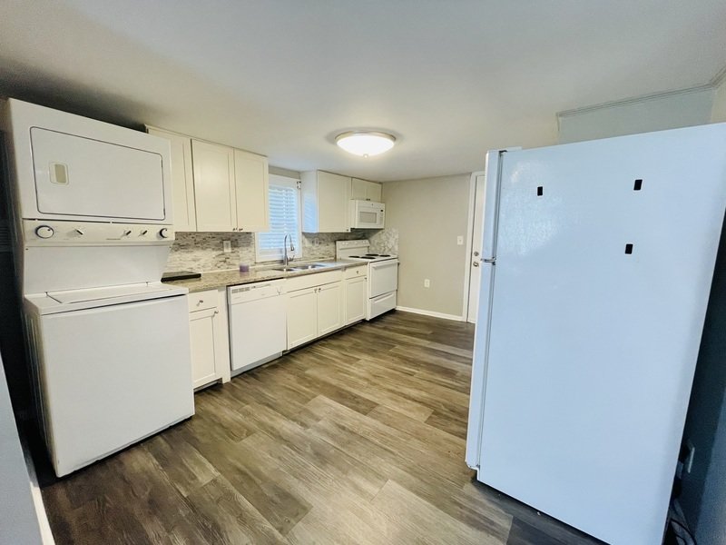 Step inside to discover a spacious living room area, ideal for relaxation and entertainment. The bedrooms are generously sized, providing ample space for rest and rejuvenation. Hardwood flooring flows seamlessly throughout the home, adding a touch of elegance to every corner. The kitchen is a chef's delight, featuring sleek white appliances, stylish countertops, and plenty of storage space. Additionally, the convenience of a washer and dryer included will make chores a breeze.