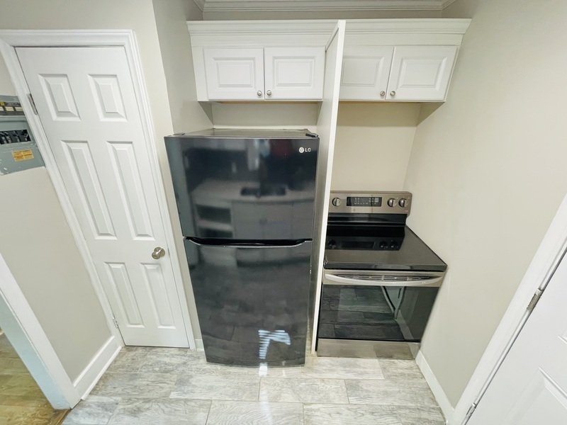 The cozy kitchen features a sleek stainless steel oven, a stylish black fridge, dual sink, nice countertops, and white kitchen cabinets that combine both functionality and style seamlessly.