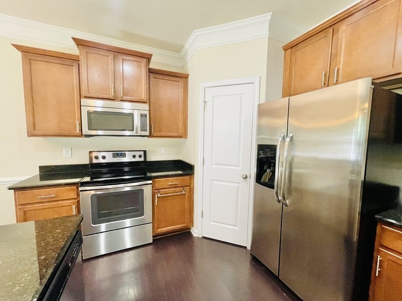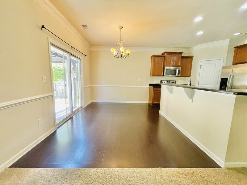 The dining room and kitchen showcase beautiful hardwood flooring, adding a touch of elegance to the living space. The kitchen is a chef's dream, boasting exquisite countertops, a dual sink, sleek stainless steel appliances, and rich brown cabinets that offer ample storage space for all your culinary needs.