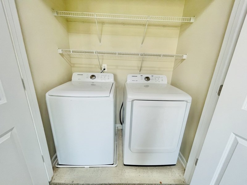 Upstairs, you'll find the bedrooms adorned in soft beige carpets, providing a peaceful retreat for rest and relaxation. A washer and dryer are conveniently located on the second floor, making laundry chores a breeze. The bathrooms are appointed with stylish tilework and feature a luxurious standing shower. The master bedroom is a sanctuary of its own, featuring gleaming hardwood floors, a spacious layout, and a master bathroom that offers both a standing shower and a spa-like bathtub. The dual sink vanity with white countertops, elegant tilework, and a walk-in closet add to the allure of the master suite.