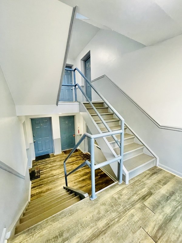 As you approach this charming apartment, you'll notice the attractive blue siding that adds a vibrant touch to its exterior.