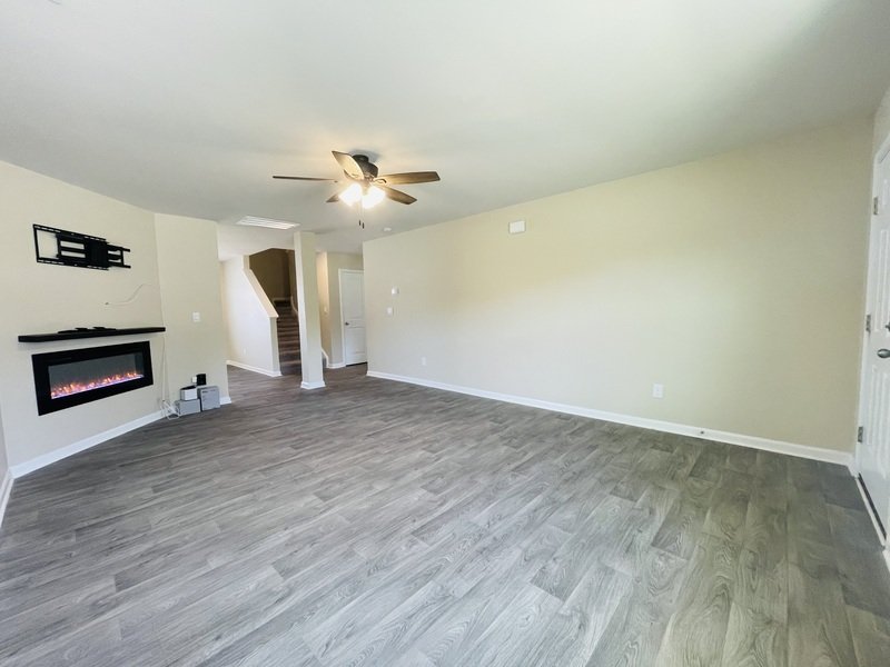 As you step inside, you are welcomed by beautiful hardwood flooring that flows seamlessly throughout the main living areas, providing a warm and inviting atmosphere. The living room features an electric fireplace that enhances the cozy ambiance, with a dazzling color-changing feature that adds a touch of elegance. For entertainment enthusiasts, a TV mount is already installed, ensuring you can easily set up your favorite viewing experience.