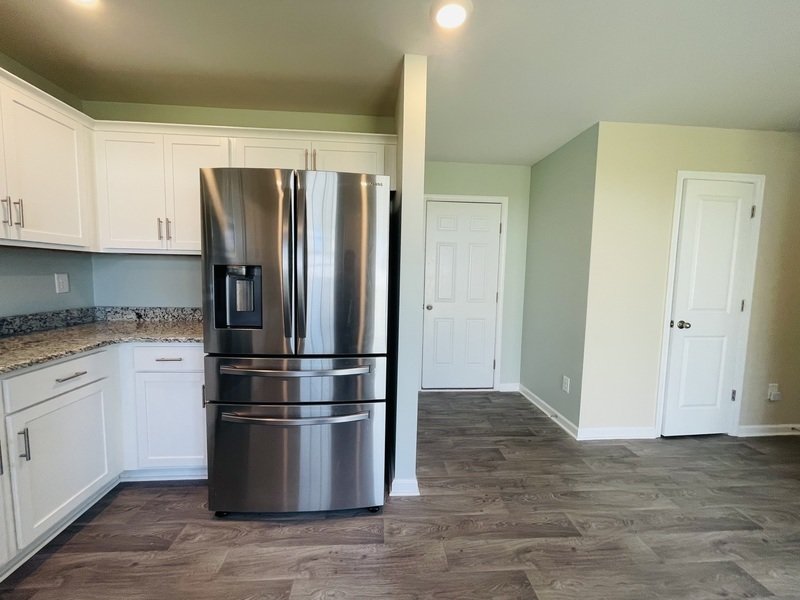 The dining area provides a perfect space for meals or gatherings. Just adjacent is a cozy kitchen equipped with sleek stainless steel appliances, including a dual freezer for added convenience. The kitchen shines with beautiful white countertops and cabinetry, combining functionality with modern aesthetics.
