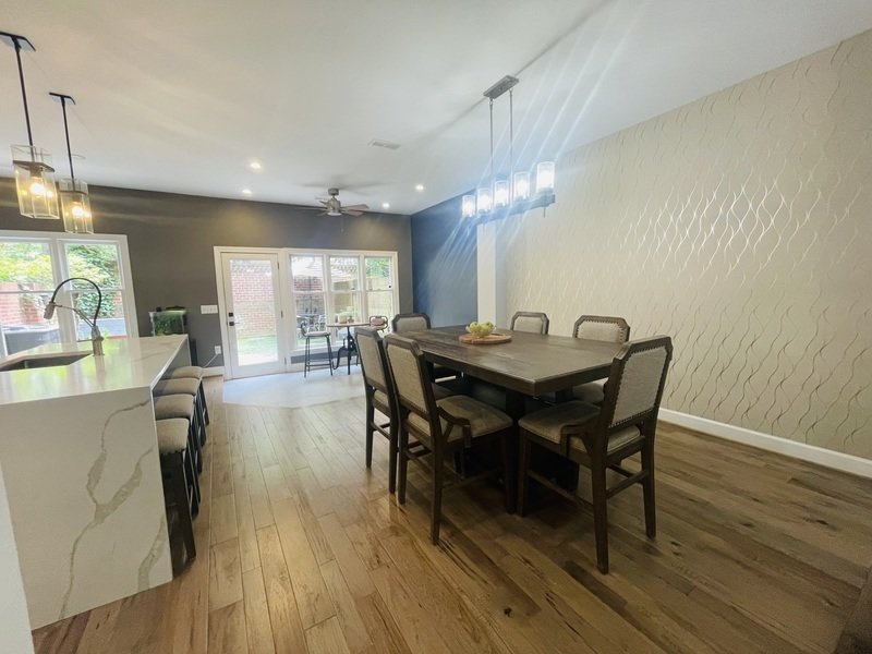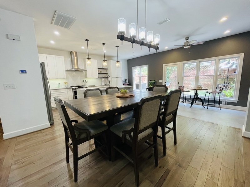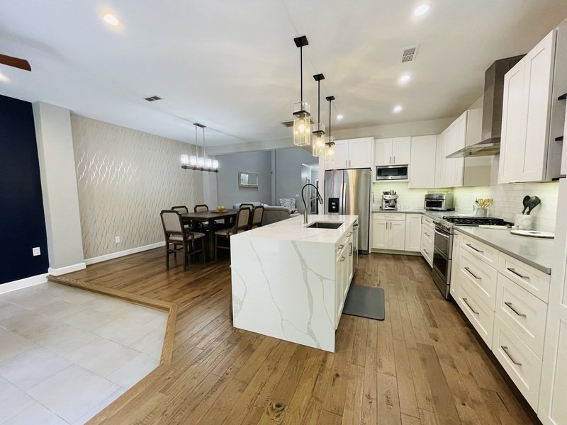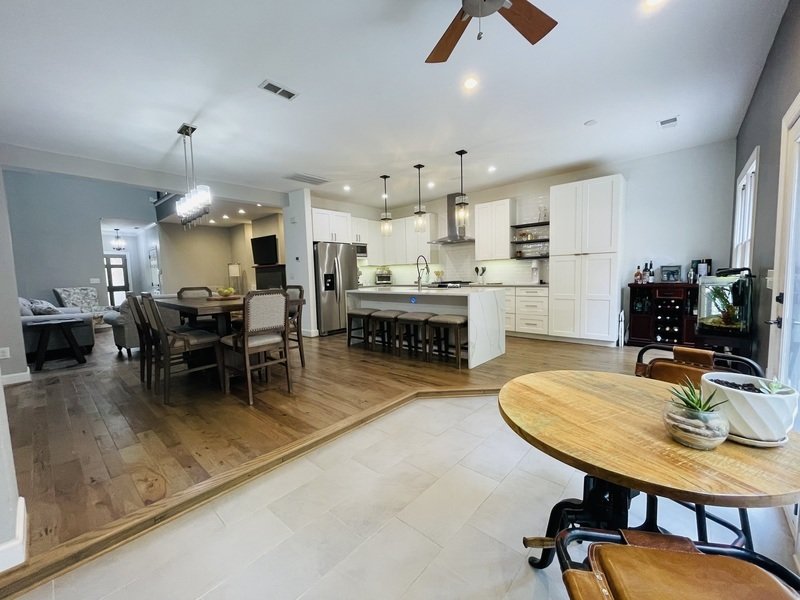 Continuing further, discover the expansive dining area that seamlessly connects to a modern kitchen, complete with stunning countertops, stainless steel appliances, a gas range with a grill, and a sleek extractor hood.