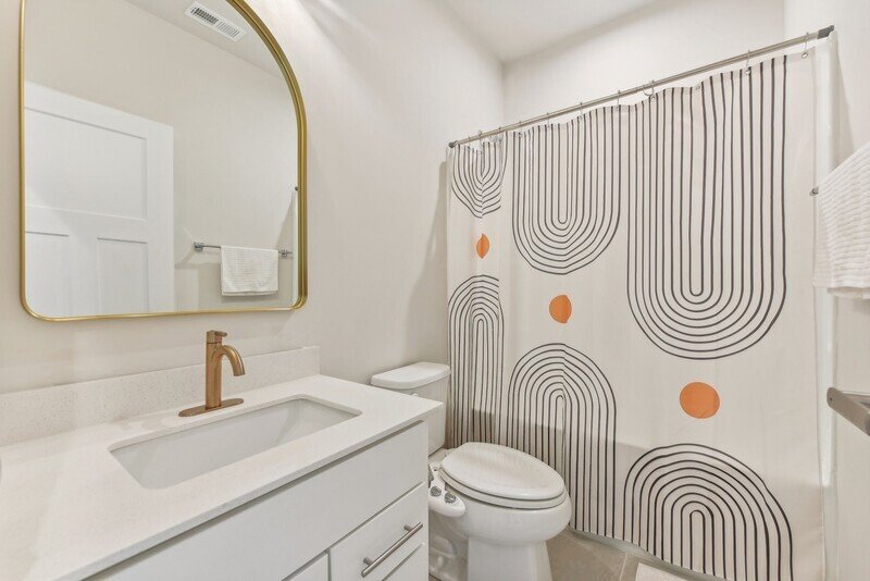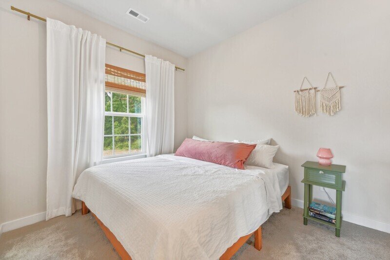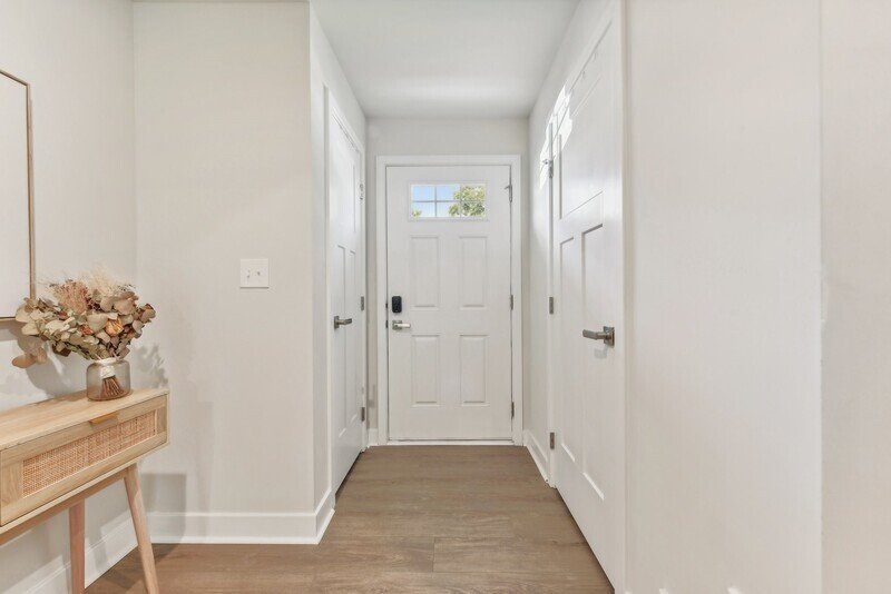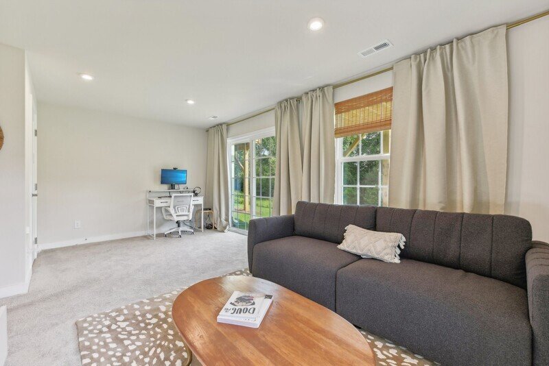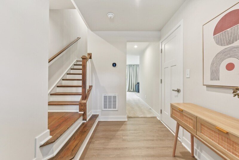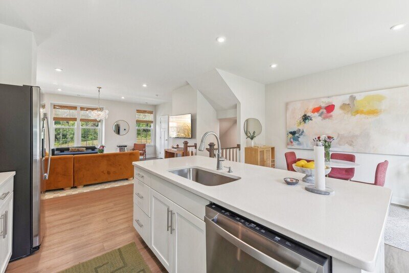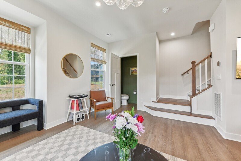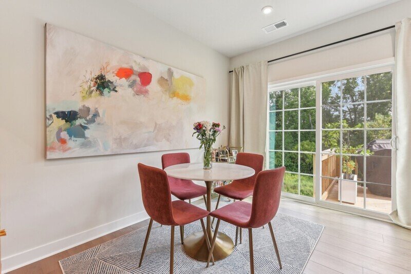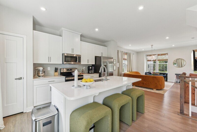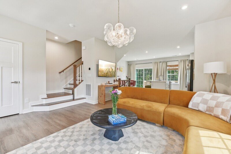 Adjacent to the living room, you will discover a cozy kitchen and dining area that seamlessly connects to the exterior back deck, perfect for al fresco dining or enjoying a cup of coffee in the morning sun. The kitchen features pristine white countertops, sleek stainless steel appliances, and stylish white cabinets, all complemented by beautiful hardwood flooring throughout the area. A well-placed half bathroom on this floor adds to the convenience of the layout.