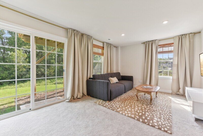 Upon entering the home, you are welcomed by a graceful staircase leading to the second floor, with a convenient entrance to the garage on your right. Moving further into the home, you’ll find a generous living room area adorned with soft beige carpeting, which creates a warm and inviting atmosphere. This space is filled with natural light, making it an ideal spot for relaxing or entertaining.