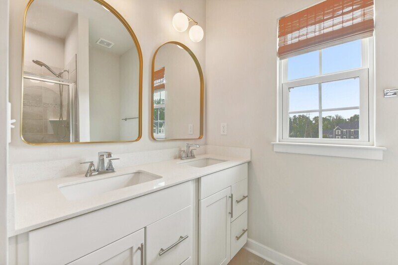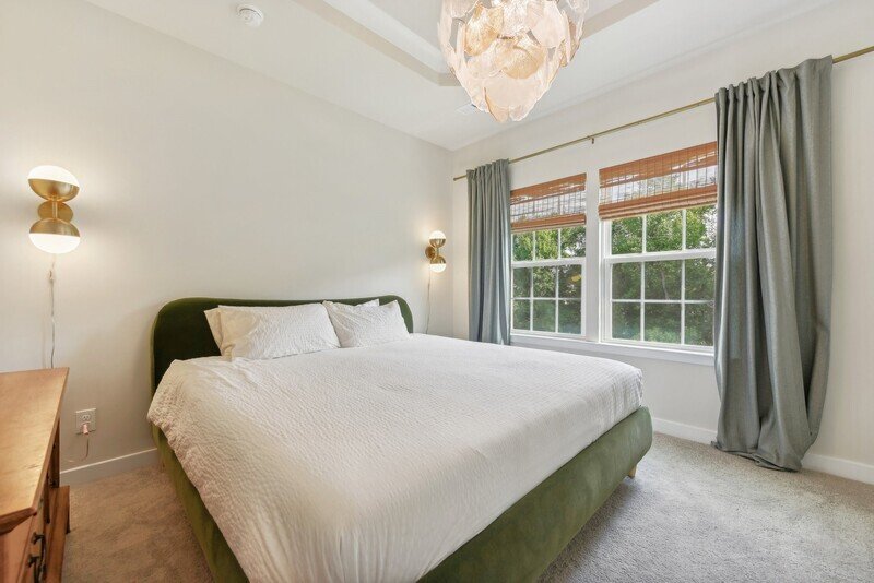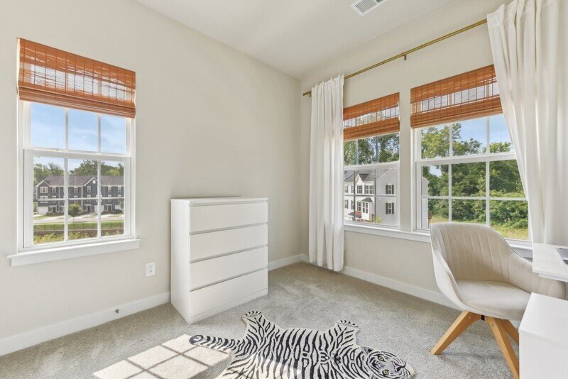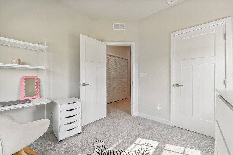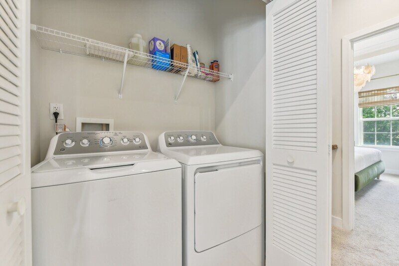 As you ascend to the third floor, you will find all three spacious bedrooms, each offering plush beige carpeting and ample closet space. The washer and dryer combo is conveniently located on this floor, making laundry a breeze. The master bedroom includes its own private bathroom, while an additional guest bathroom serves the other two bedrooms. Both bathrooms boast elegant tile work, contemporary countertops, and fixtures that include a standing shower, a soaking tub, and dual sinks for added luxury.