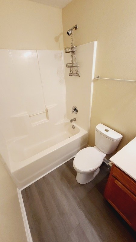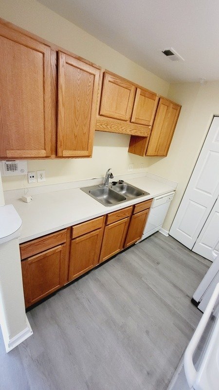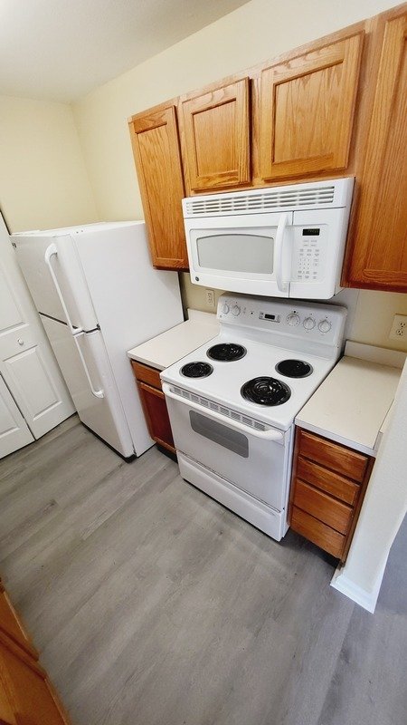 The bathrooms are tastefully designed, featuring a combination of tub and shower options that cater to your bathing preferences. The heart of the home, the kitchen, is both cozy and functional, showcasing elegant white countertops that contrast beautifully with the rich brown kitchen cabinets. Equipped with white appliances, this kitchen is not only aesthetically pleasing but also practical for all your culinary adventures.