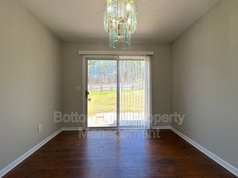 Convenient Corner Kitchen: Cozy kitchen area with backyard views. Garbage disposal, stove, refrigerator, and dishwasher with a beautiful chandelier over dining area.