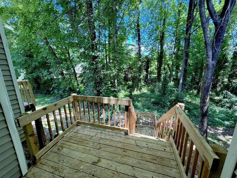 Patio door leading to an outdoor wooden deck with staircase and serene forest views