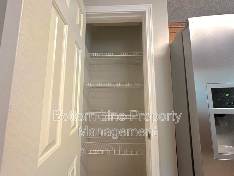 Kitchen equipped with granite countertops, stainless steel appliances, pantry, and bar seating