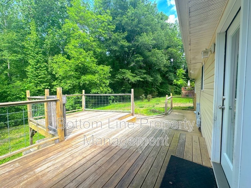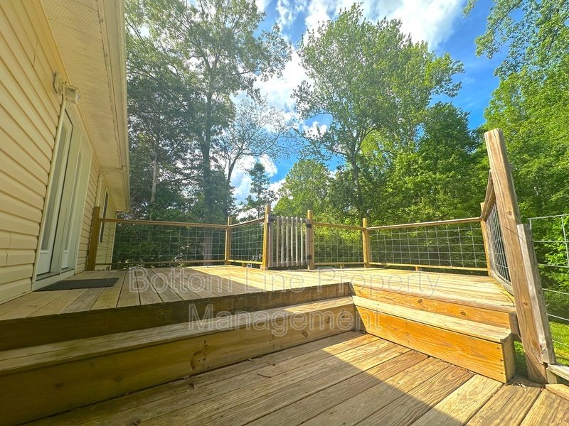 Expansive back deck overlooking a wooded backyard