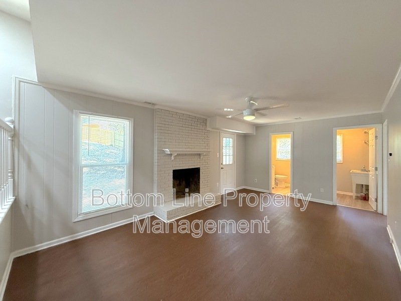 Downstairs offers a cozy living room with a white brick fireplace, a half guest bath, and utility closet with washer/dryer hookups and a rinse-off station. A bonus room and an additional bedroom are also located on this level, with entry access from the side of the home.