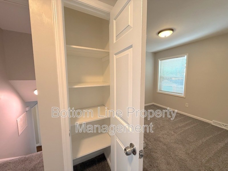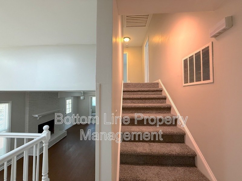 Upstairs, carpeted stairs and hallway lead to two bedrooms with wardrobe closets, a hallway linen closet, and a shared full bathroom with tub/shower combo. At the end of the hall is a primary bedroom with wardrobe closet and a private en-suite bathroom featuring tile flooring and a tiled shower with glass door.