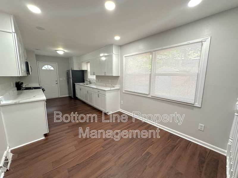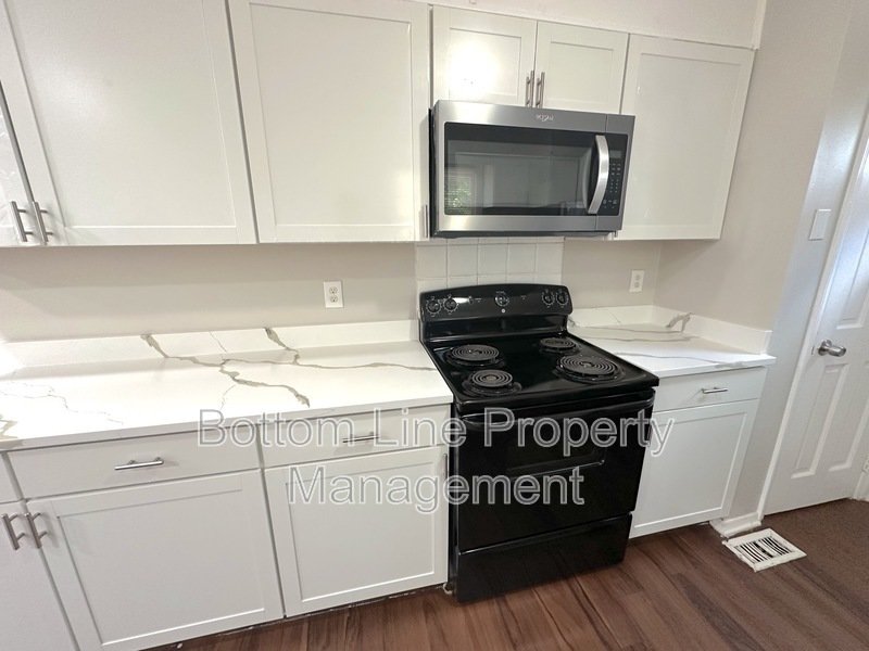 This newly renovated kitchen features designer quartz countertops, a black refrigerator, electric stove/oven with range hood, ample cabinetry, and a pantry closet. An adjacent dining area adds convenience and flow.