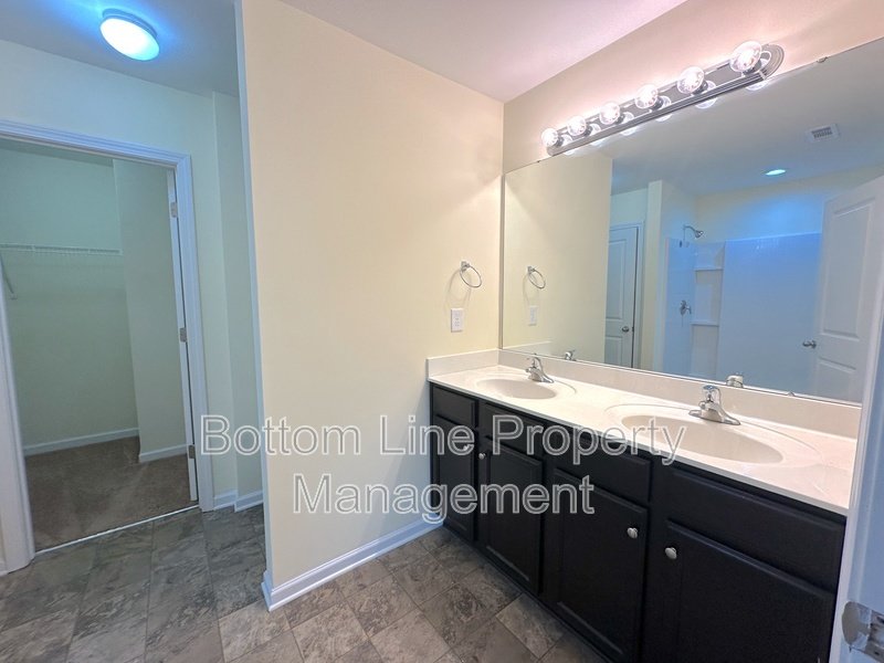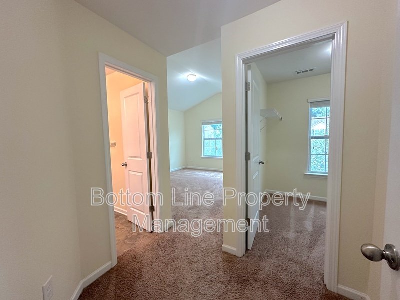 The second floor includes two bedrooms carpeted for comfort. The primary suite features a vaulted ceiling, walk-in closet, and en-suite bathroom with dual sinks, and a shower.