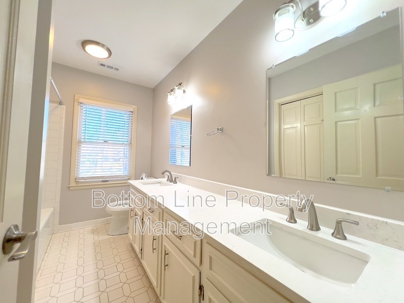 Upstairs, the primary suite includes a private bath with a tiled stand-in shower, while the remaining three bedrooms share a dual vanity bath with a tub. Flooring throughout the home is a mix of carpet, tile, and luxury vinyl plank (LVP), complemented by unique light fixtures and faux wood blinds.