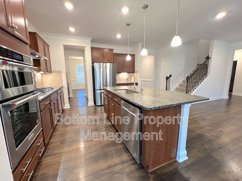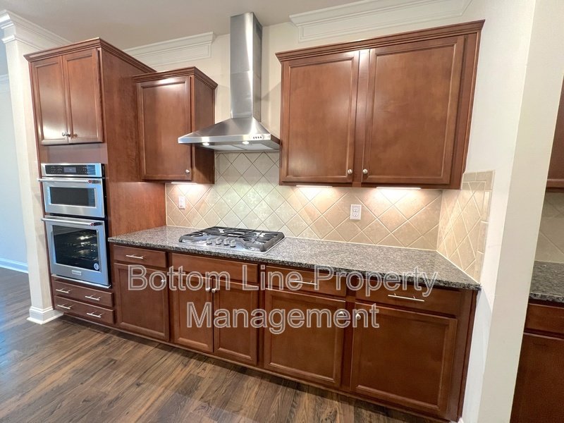 • Gourmet kitchen with high-end stainless steel appliances including gas cooktop, convection oven, built-in microwave, large refrigerator, dishwasher, and garbage disposal