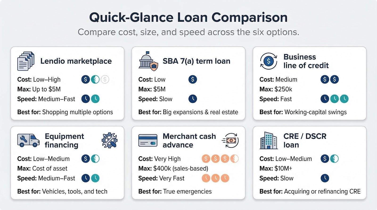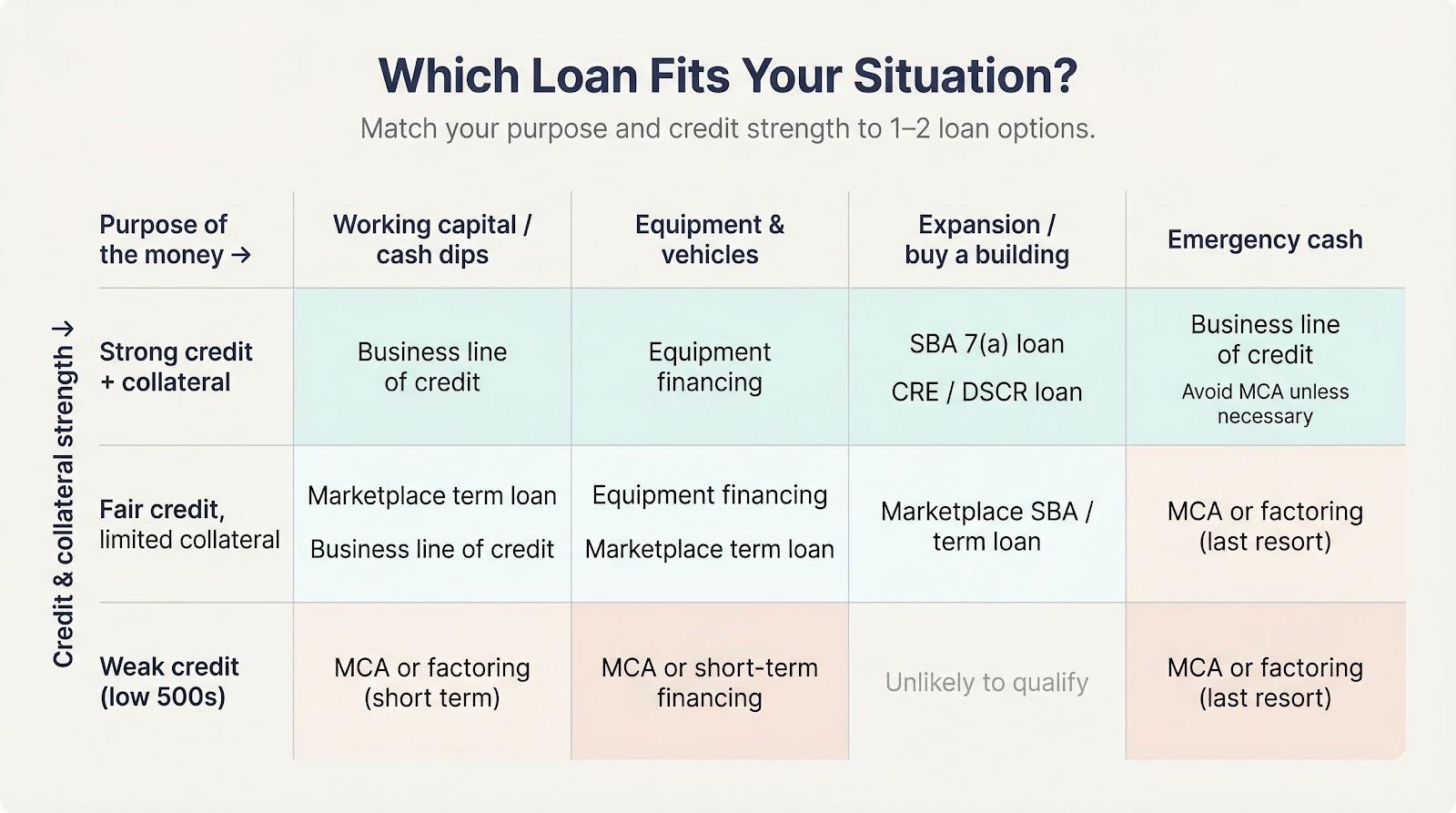 Second, review your current strength: credit score, collateral, and time in business. Strong credit plus collateral opens the lowest-cost tiers of SBA or CRE financing. Fair credit but little collateral points toward a marketplace term loan or equipment financing. Scores in the low 500s leave only MCAs or factoring, and those should stay short term.