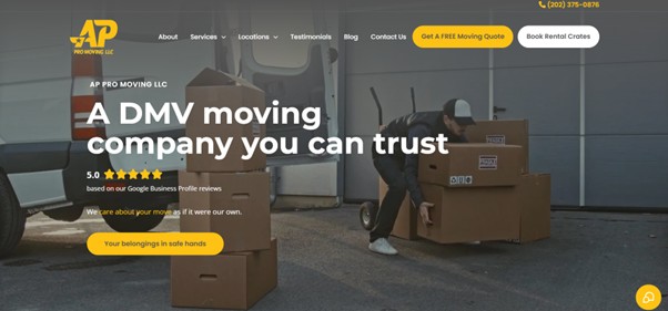 AP Pro Moving LLC operates throughout the DMV area with offices in Washington, DC, and Arlington, Virginia. The company provides local and long-distance moving services with a focus on residential, commercial, and college relocations. AP Pro Moving is licensed and insured, emphasizing transparent pricing, competitive rates, and a customer-centric approach with the motto "Move at a fast pace with a friendly face."