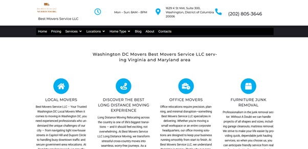 Best Movers Service LLC provides moving and relocation services across the Washington, DC metropolitan region with extended operating hours from 8:00 AM to 8:00 PM Monday through Sunday. The company offers local and long-distance moving, packing, furniture assembly, office relocation, and junk removal services as a fully insured and licensed provider.