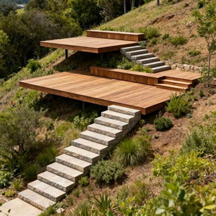 For steep drop-offs, elevated decks extend out over the slope, creating flat usable space while maintaining views. Cantilevered sections hang over the slope with minimal visible supports, creating a floating effect. They're engineering-intensive but visually stunning.