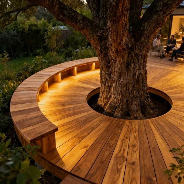 Tree integration through curved cutouts solves a major problem. Build openings with protective rings around trunks, allowing 3-6 inches of clearance for growth.