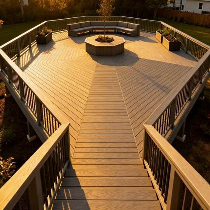 Hexagonal and octagonal shapes break away from boring rectangles entirely. These work well for destination decks at the end of a yard where you want a defined "room" feeling.