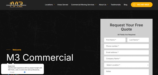 M3 Commercial Moving & Logistics | Nationwide commercial moving with certified crews and industry-specific expertise | US DOT #: 1829172, MC #: 691493, insured and background-checked crews | 5/5 (79 reviews) |
